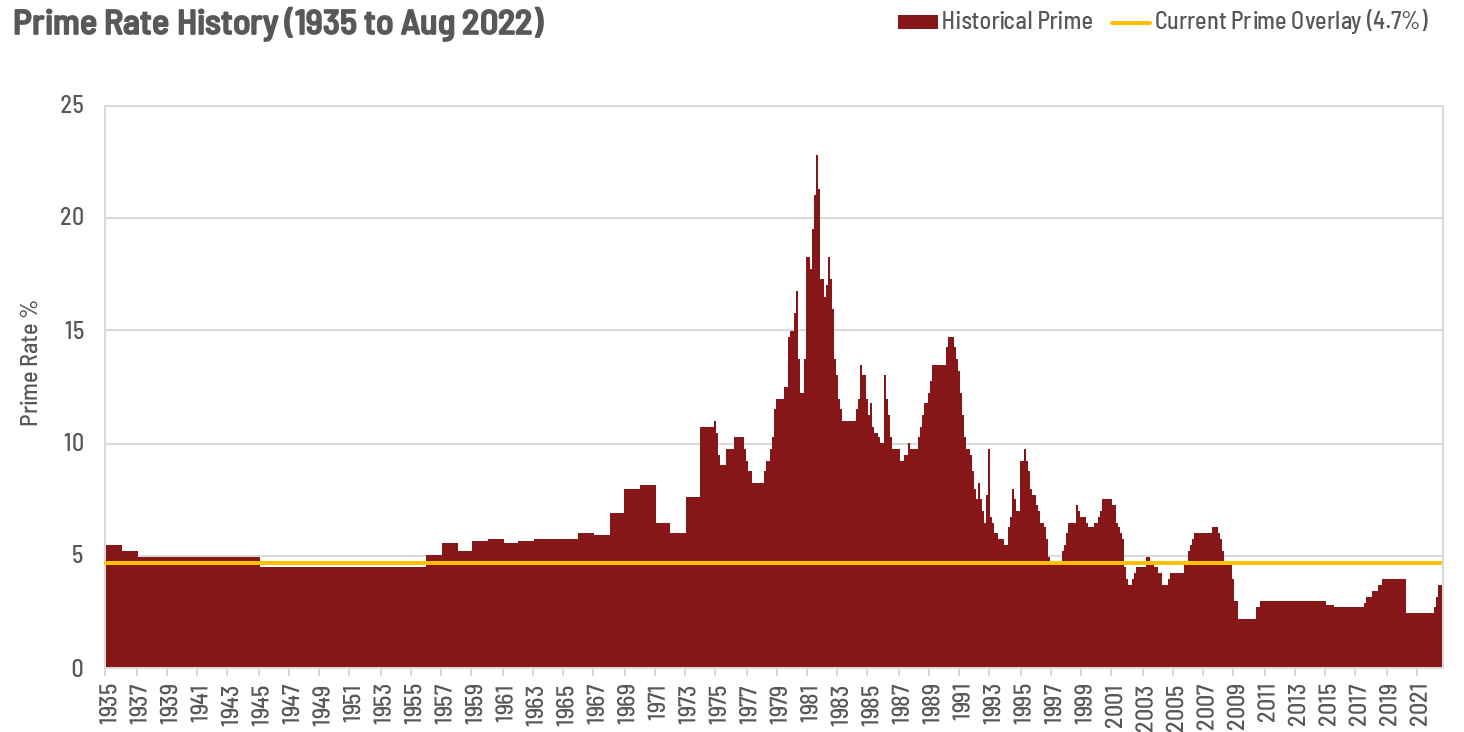 Second is a longer term chart of the last 80+ years and you can see prime has usually been at 5%+.